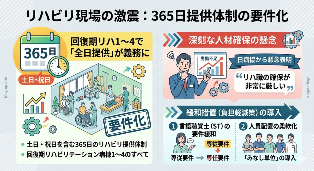 - 回復期リハ1〜4で「全日提供」が義務に: 土日・祝日を含む365日のリハビリ提供体制が、回復期リハビリテーション病棟1〜4のすべてで施設基準として要件化されました。