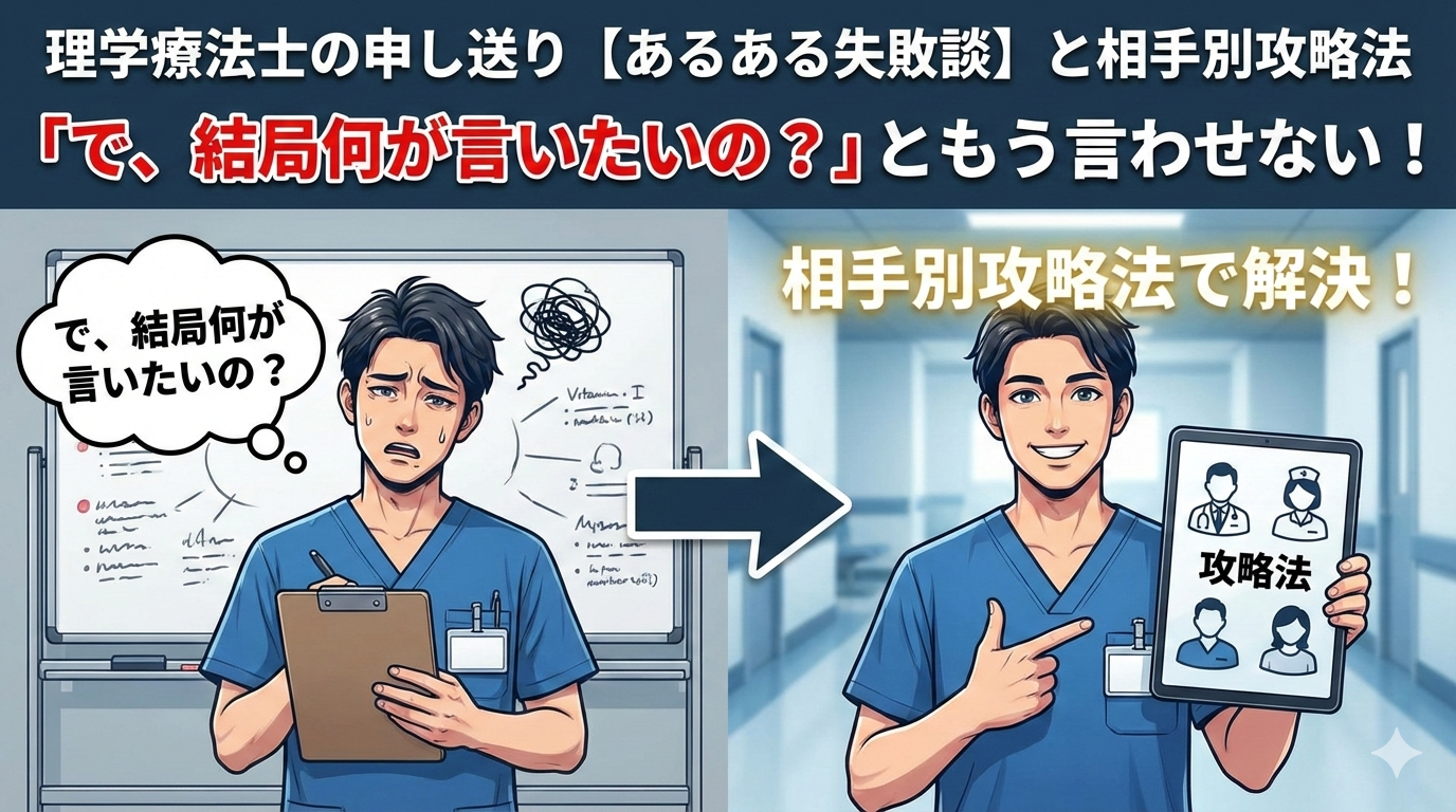 この記事では、理学療法士が陥りがちな「あるある失敗談」から伝わらない原因を解き明かし、【医師・看護師・先輩PT】など相手別に「響く」申し送りの極意を、具体的なNG/OK例文付きで徹底解説します。