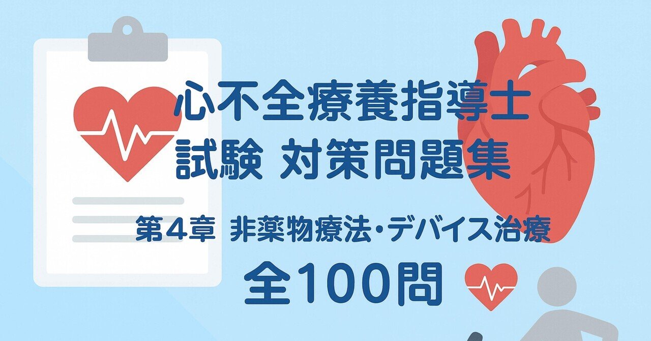 はじめに こんにちは。 本記事では、心不全療養指導士試験を目指す方に向けて、**第4章「非薬物療法・デバイス治療」に特化した試験対策問題集(全100問)**をご用意しました。 本問題集は、誤字や脱字が含まれる可能性があります。また、すべての...