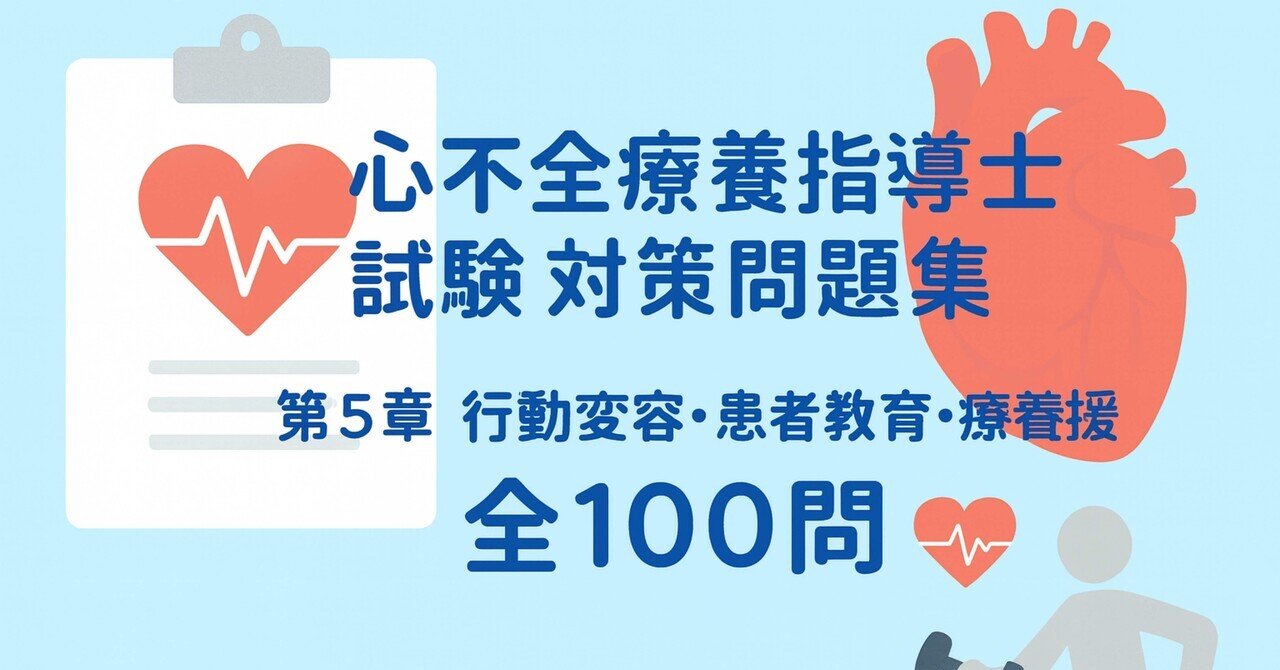 はじめに こんにちは。 本記事では、心不全療養指導士試験を目指す方に向けて、**第5章「行動変容・患者教育・療養支援」に特化した試験対策問題集(全100問)**をご用意しました。 本問題集は、誤字や脱字が含まれる可能性があります。また、すべ...