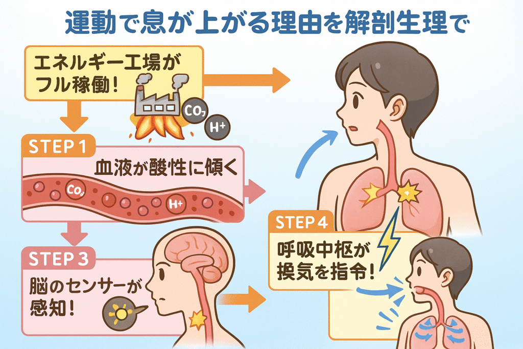 【イメージ】筋肉(CO2産生) → 血液(酸性化) → 脳のセンサー(感知) → 呼吸中枢(指令) → 呼吸筋(換気促進!)という流れ