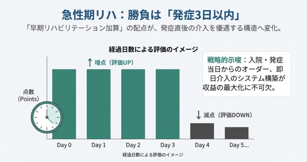 - 3日以内の介入が鍵: 入院または発症から3日以内の介入は増点される一方、4日目以降は減点されるという、非常にメリハリの効いた配点になります。