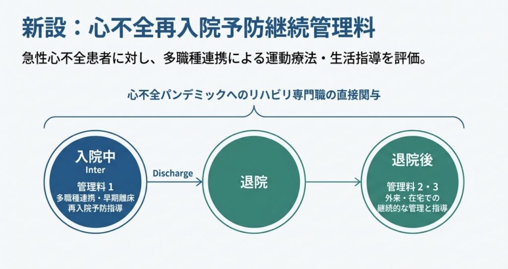 - 心不全の再入院予防: 「心不全再入院予防継続管理料」が新設され、多職種連携による運動療法や生活指導が評価されます。PTによる急性期からの関わりが、退院後の生活を守る重要な指標となります。
