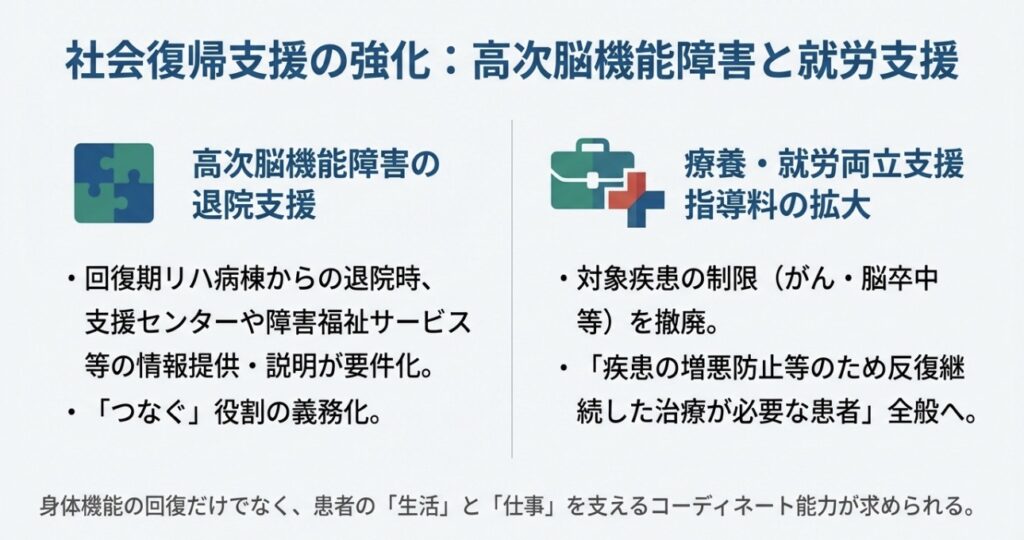 - 高次脳機能障害の連携強化: 退院時に地域の支援センター等へ情報提供を行うことが要件化されます。
