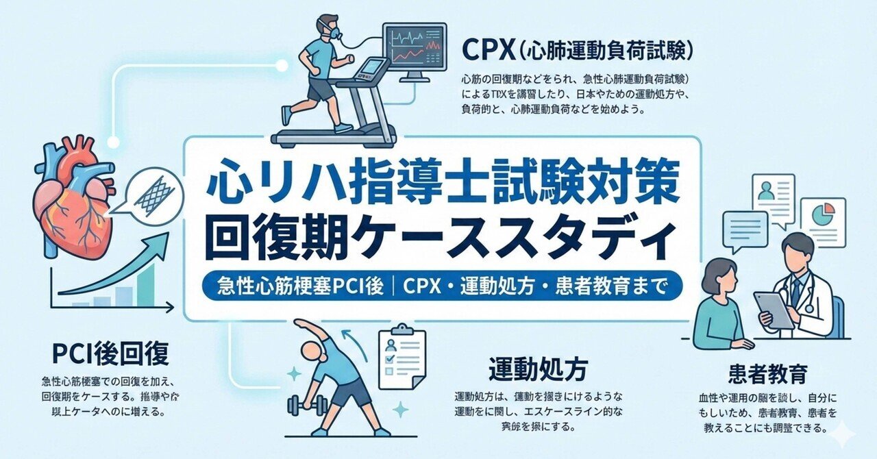 急性心筋梗塞PCI後・回復期の58歳男性を例に、CPXデータの読み方から運動処方の立て方・患者教育の内容・考察の書き方まで、報告書の全セクションを実際の記載例とともにまとめたnote記事を公開しています。