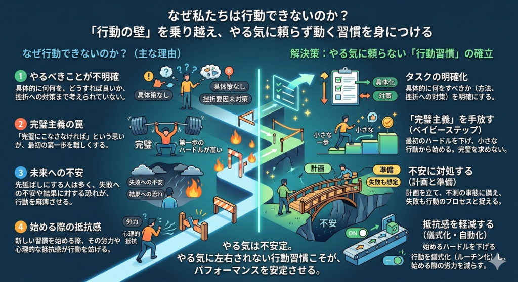 - 始める際の抵抗感: 新しい習慣を始める際、その労力や心理的な抵抗感が行動を妨げます。これらの「行動の壁」を乗り越えるために、解決策を推奨されています。