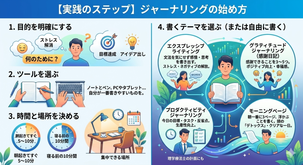 ステップとコツジャーナリングには様々な方法がありますが、ここでは特に効果的な種類と実践のコツをお伝えします。