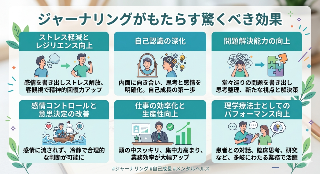 - 理学療法士としてのパフォーマンス向上: 患者さんとのコミュニケーション、臨床思考、研究活動など、多岐にわたる業務において、ジャーナリングで培われる自己認識力や問題解決能力は、確実に皆さんのパフォーマンスを高めるでしょう。