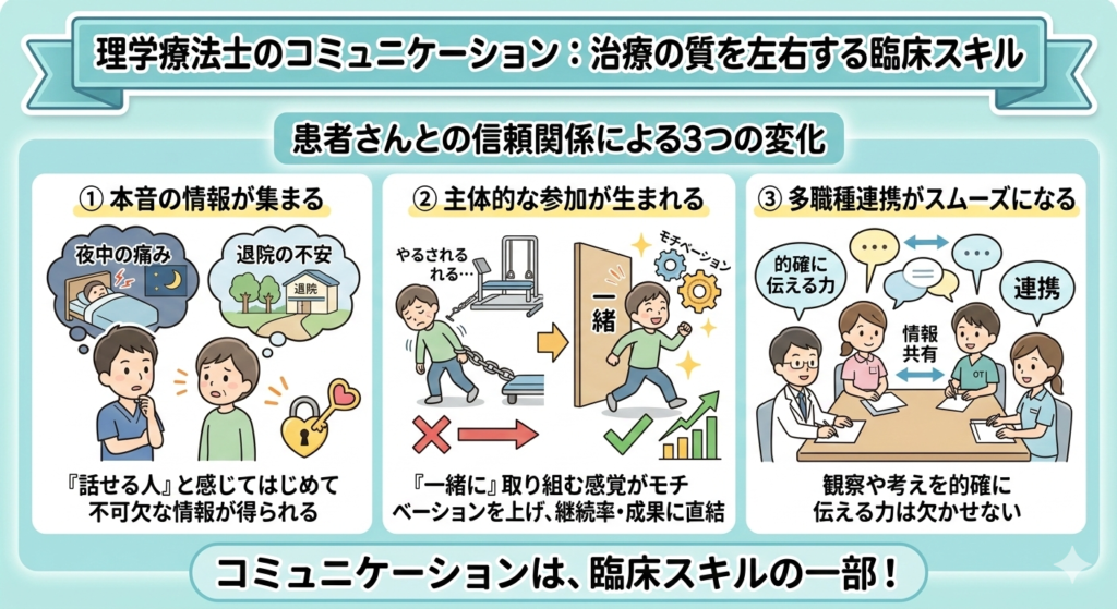 理学療法士のコミュニケーションは「なんとなく仲良くする」ためのものではありません。治療の質を直接左右する、臨床スキルの一部です。