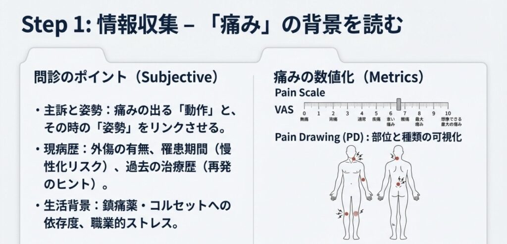 腰痛評価は、単なる痛みの部位確認から始まるのではありません。対象者の主観的なQOL(生活の質)評価は必須事項です。