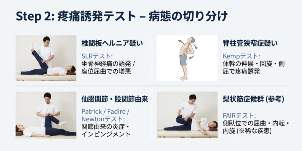 - 誘発テストの組み合わせ: SLRテストやKempテスト、仙腸関節障害を疑うNewtonテストなどを組み合わせ、病態を推測します 。