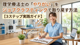 キャリア・転職 理学療法士の「やりがい」をジョブクラフティングで取り戻す方法【3ステップ実践ガイド】 理学療法士として働きがいに悩んでいませんか?日々の業務を自ら再定義する「ジョブクラフティング」を取り入れれば、今の職場のまま意欲を取り戻せます。本記事では、明日から試せる3ステップの実践ガイドを詳しく解説。情熱を再燃させ、自分らしいキャリアを築くヒントが満載です。 2026.03.23 キャリア・転職理学療法士